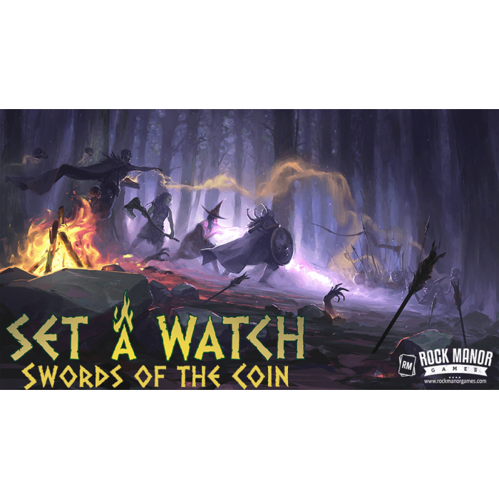 The Kingdom is in grave danger once again, but our mighty adventurers are nowhere to be found. The King has stepped in and offered to pay any mercenary for taking up arms against the darkness. This quest falls on the shoulders of four mercenaries, each with a unique set of skills, to band together to vanquish this evil from the Kingdom. Set a Watch: Swords of the Coin is both a standalone game for 1-4 players and an expansion that can be combined with the original cooperative game. Featuring all new characters, this bunch of adventurers has to be motivated to work together. Every round you will visit all new locations and pick an adventurer to rest and get paid to take camp actions. You can use this coin to purchase powerful items from the new Merchant board and item deck. These items will assist the rest of the party on watch as they battle a line of all new creatures trying to make their way into camp. It is still a battle to keep the campfire burning! Use your wits and skill to fight for the light…or all will perish in the darkness. —description from the publisher